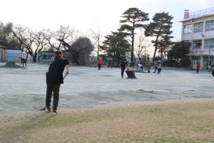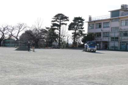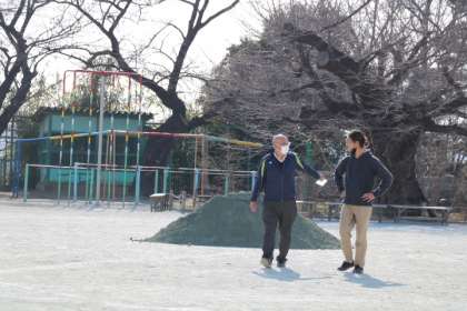 校庭では、霜が降りたり、ぬかるんだりしないようグリーンダストを入れて、先生たち総出で最終整備をしています。