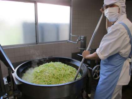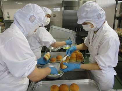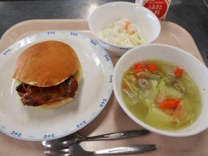 今日は照り焼きチキンサンドです。給食室で、パンに切れ目を入れて、からしバターを塗り、炒めたキャベツをはさんでいます。照り焼きチキンも給食室で朝からたれにつけ込んでおオーブンで焼いて作りました。とてもおいしい照り焼きチキンサンドができました。ポトフも野菜がたっぷり入って栄養満点です。