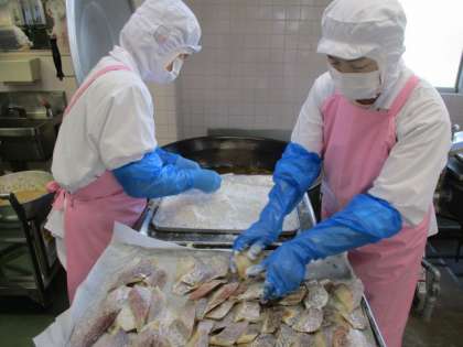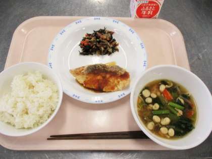 今日の魚は真鯛です。2月から4月にかけてが旬の魚です。小麦粉をつけて油で揚げた後、すりおろしたりんごをつかったバーベキューソースをかけました。とてもおいしい真鯛で、こどもたちはよく食べていました。