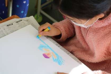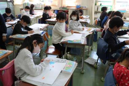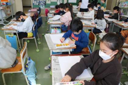 1年生図工の様子です。4月に入学してくる1年生に、砧小学校の1年間を紹介するなら・・と考え絵に描いています。「何を描いているの?」と聞くと、