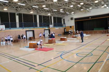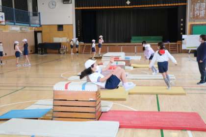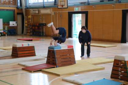 4年生の体育の授業の様子です。跳び箱の台上前転に取り組んでいました。手をつく位置、踏切の位置など気を付けることが多くて難しい技です。友達とアドバイスし合いながら練習できていました。