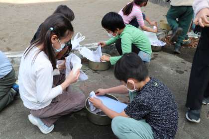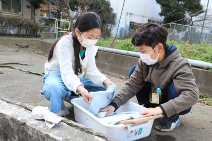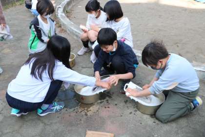 3年生総合「昔の道具を使ってみよう」の様子です。今日は洗濯板を使って、ぞうきんやタオルを洗っています。