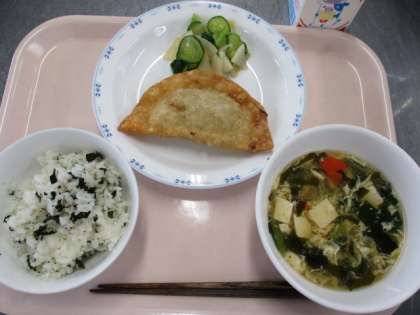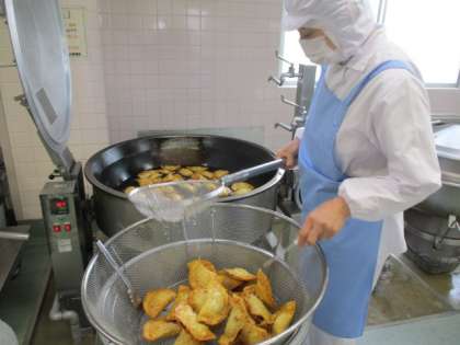 今日の給食は6年生のリクエスト給食です。特注の皮で作るジャンボぎょうざは給食でしか食べられない味です。