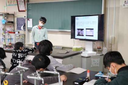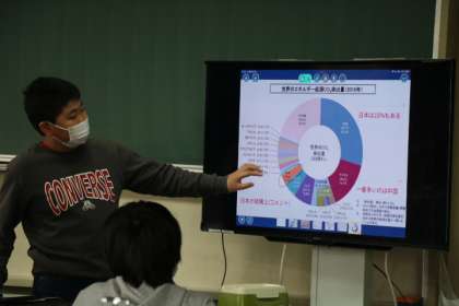 6年生理科「人と環境」の発表の様子です。地球環境のこと、環境破壊のこと、地球温暖化のことなど調べたことをグラフや資料を見せながら発表しています。聞いている子たちも画面にくぎ付けになったり、ノートにメモを取ったりしながら熱心に聞いています。