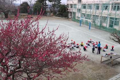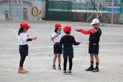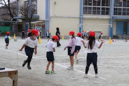 1年生体育短縄跳びの様子です。グループでなかよく技を研究しています。