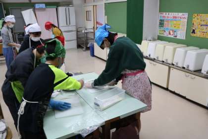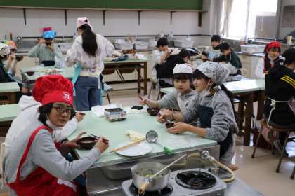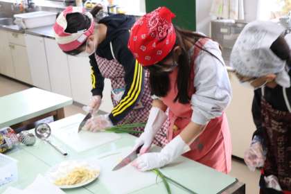 6年生の家庭科の授業の様子です。今日はみんな楽しみにしていた調理実習で、味噌汁を作っていました。包丁の使い方も上手にできていました。煮干しからとった出汁で作った味噌汁の味にとても満足している様子でした。