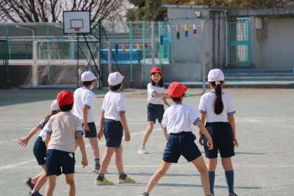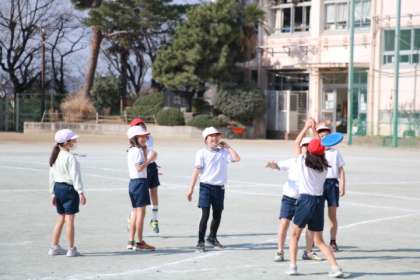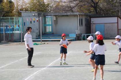 3年生の体育の授業の様子です。天気もよく、とても暖かい校庭でアルティメットフリスビーの試合を行っていました。まだ試合に慣れていない様子で、なかなかフリスビーのパスがつながらないようでした。どうやったらパスがつながるかチームで工夫できることを考えていました。