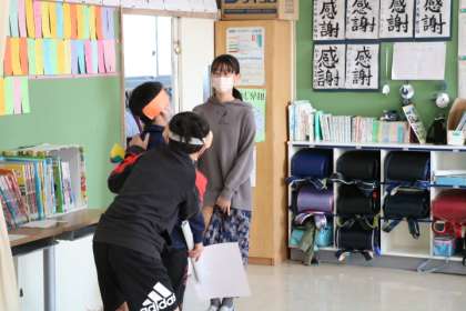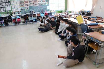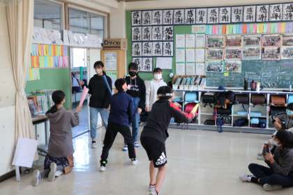 6年生の外国語の授業の様子です。今日は英語劇の発表会でした。教室に行くと「桃太郎」の劇の真っ最中でした。練習の成果が出て、台詞もなめらかに言えていました。コミカルな演技に見ている児童も笑顔になる楽しい発表会でした。