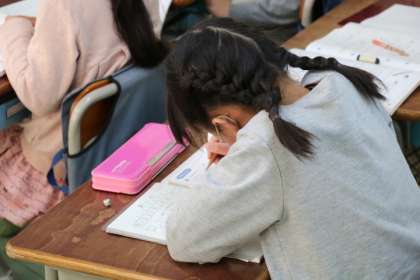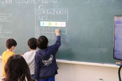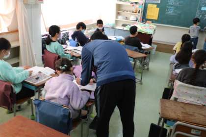 2年生の算数の授業の様子です。2年生の算数の復習問題を解いていました。みんなで答え合わせをしたり、教え合ったりしていました。しっかりまとめをして3年生に進級したいですね。