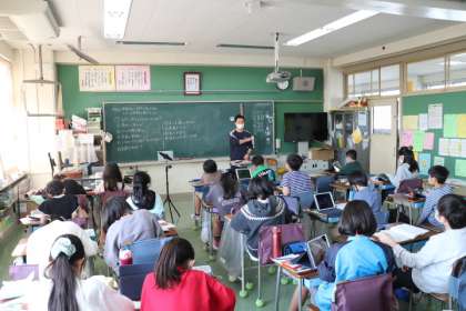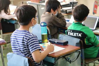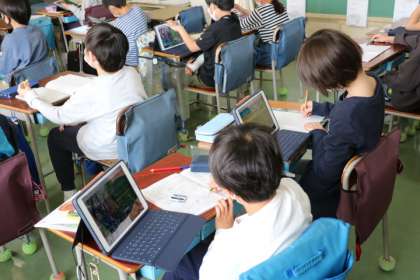 4年生の社会の授業の様子です。小笠原村の自然を守るための活動についてタブレットで調べたことをみんなで共有していました。小笠原村で実際に行われている「気配りウォッチング」や「キャンプ禁止」などの活動が見つかったようです。