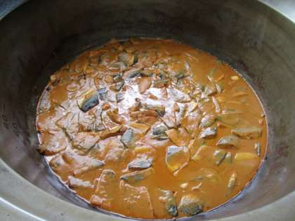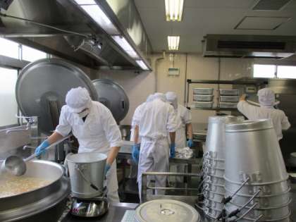 さばには血や肉をつくるたんぱく質や、血液をさらさらにするEPAと頭の働きをよくするDHAが多くふくまれています。今日はさばを給食室の大きな釜でみそ煮を作りました。