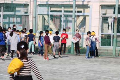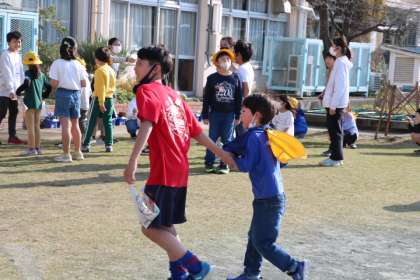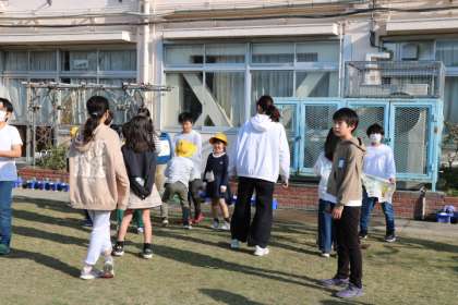 まずは、なかよし班ごとに集合します。集会委員の司会進行で、全校で大きな円を作り「マイムマイム」を踊りました。中心の円にいる集会委員会のお手本を見たり、なかよし班のお兄さんお姉さんに教えてもらったりしながら踊りました。