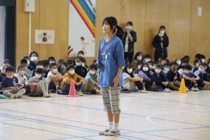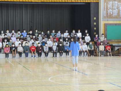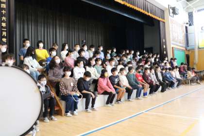 6年生が正面雛壇に座り、はじめの言葉の5年生が出てきました。