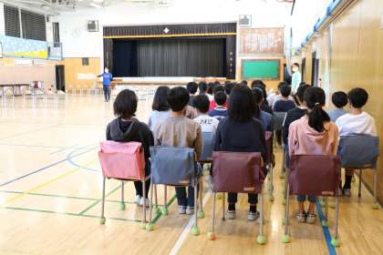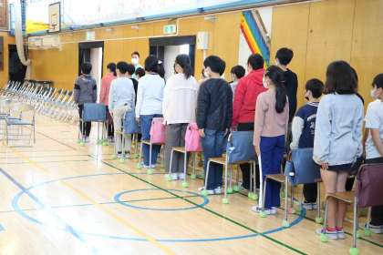 5年生は初めて卒業式の会場に入りました。今年は3年ぶりに、5年生が式に参列し入退場曲を担当し、在校生代表として6年生の門出を送ります。