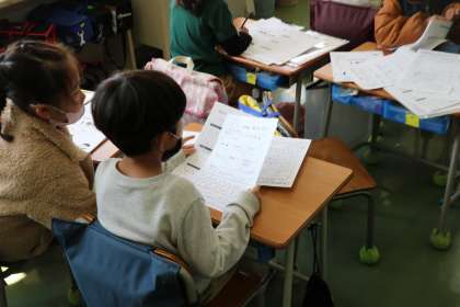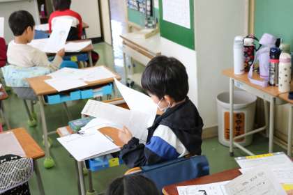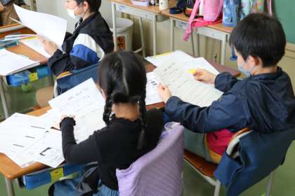 1年生の教室の様子です。3学期に教室に掲示していたカードを整理していました。あんなことやこんなこと、学習したことを思い出しながら、きれいに綴っていました。