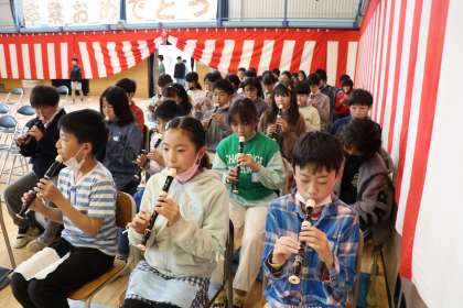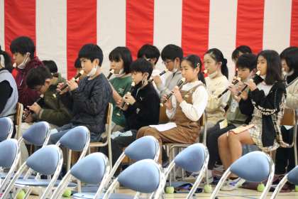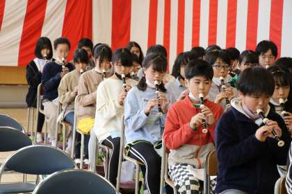 5・6年生卒業式合同練習の様子です。今日は初めて入退場を5年生のリコーダーと歌に合わせて練習しました。5年生の、緊張感をもって練習に臨む姿勢がとても立派です。