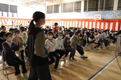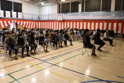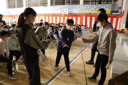 ビブリオバトルとは、自分が読んで面白いと思った本を一人5分で紹介します。発表の後に2分間質問タイムを取ります。発表に関するディスカッションの時間にもなります。参加者みんなが発表を終えた後、「どの本が一番読みたくなったか」を基準とした投票を行い、最多得票を集めた本をチャンプ本とする読書ゲームです。今日は5年生各クラスの代表1名が、最後のバトルをします。審査員はもちろん5年生、しんさいんの5人の先生たち、そしてゲストに招待した4年生です。