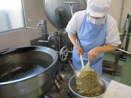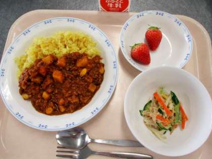 ハッシュドビーフは薄切りの牛肉と野菜を煮込んだ料理です。「ハッシュ」は「細かく切った」という意味があります。給食のハッシュドビーフは、小麦粉とバターで作ったブラウンルウも手作りです。タマネギも飴色になるまで炒めてあります。とてもおいしくできました。こどもたちからも大好評で、どのクラスの食缶も空っぽになって給食室に帰ってきました。