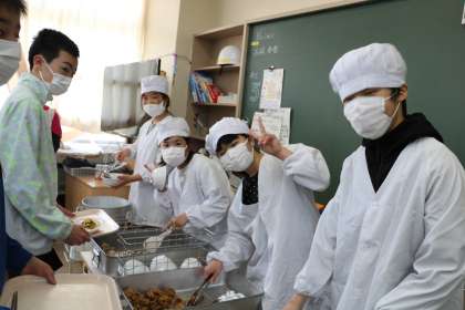 今年度最後の給食です。卒業・進級をお祝いしてお赤飯です。6年生にとっては最後の小学校の給食です。給食配膳の様子から密着しました。
