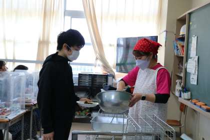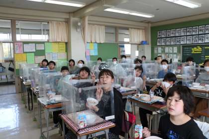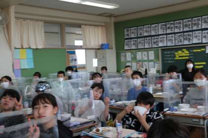 今日で、今年度の給食はおしまいです。パーテーションは次年度から使いません。パーテーションは、以前お知らせしましたように持ち帰りたい子は、お持ち帰りいただいても結構ですが、大きくて持ち運びも危険なので学校で処分させていただきます。