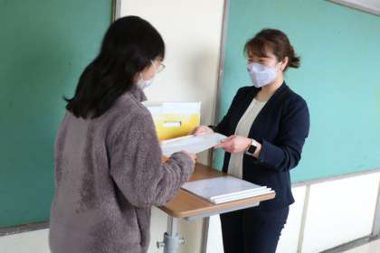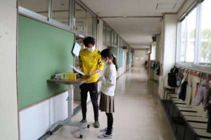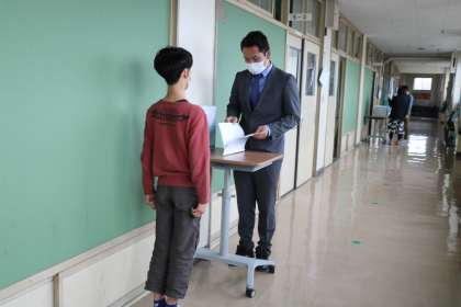担任の先生が教室や廊下で、一人ひとりに言葉を添えながら渡しています。写真は