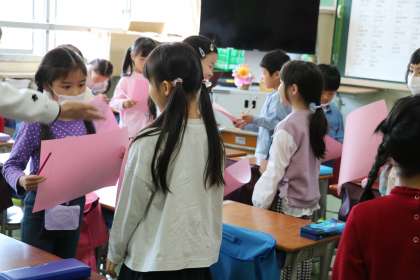 1年生の様子です。ピンクのカードを一人一枚持ってお友達のサインを集めるゲームです。先生の説明を聞く顔が真剣です。お友達とジャンケンをしてから、好きなものを聞いてからと、クラスによってやり方は様々ですが、みんな楽しそうに取り組んでいます。早くみんなの名前を憶えられるといいですね。