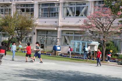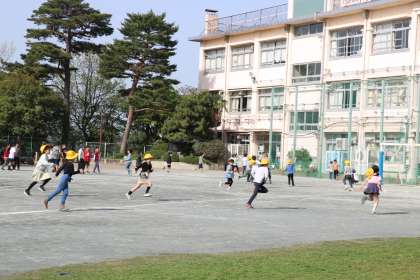 教室に上がる前に、植木鉢に水をあげる2年生もいます。朝遊びが始まりました。