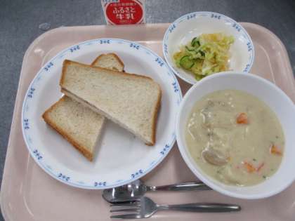 クリームシチューは、スープは鶏ガラからとり、ルウは小麦粉とバターで手作りしています。最後に生クリームを加えて仕上げています。とてもおいしく、こどもたちから人気があります。給食は化学調味料等の添加物は使用せず、手作り調理を行っています。