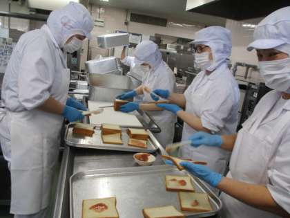 いちごジャムサンドは一枚一枚給食室でパンにジャムを塗って作っています。