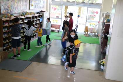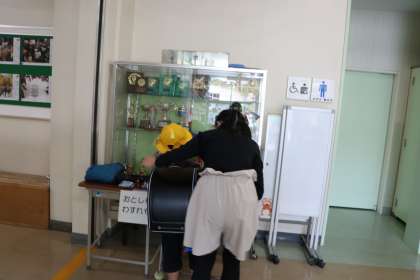 上履きに履き替えて真っすぐ階段を上がると思ったら、左へ曲がってしまう1年生。慌てて6年生が一緒についていくと、廊下に置いてあるガラスケースの前へ。中にはトロフィーがたくさん入っています。砧フットボールクラブ(旧砧少年サッカーチーム)や砧小ブルーウイングス野球部が試合で活躍し、いただいてきたものです。それが見たかったのですね。ひとしきりおしゃべりをしてから教室へ向かいました。