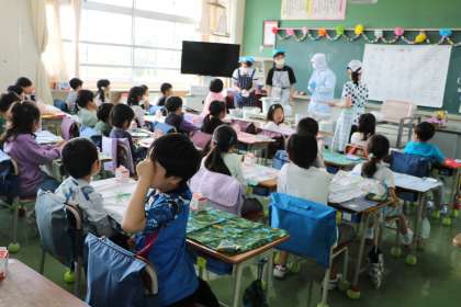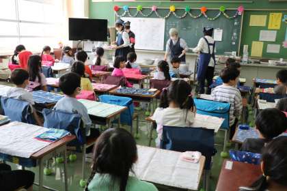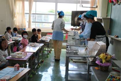 2日目の給食です。今日もたくさんの大人の方が手伝いに来てくれました。