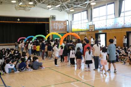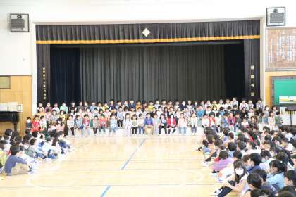 1年生を迎える会が行われました。昨年度の後期代表委員が司会などのやってくれました。1年生が6年生と手をつないで入場してきました。みんなの温かい拍手で迎えられました。6年生の代表児童が1年生にやさしく語りかけて会がスタートしました。