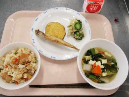 今が旬のたけのこを使って、たけのこごはんを作りました。とれたての新鮮なたけのこを給食室の大きな釜で皮ごとあくぬきをしました。とってもおいしいたけのこごはんができました。天ぷらも給食室で揚げたてです。1年生もおはしを上手に使って給食を食べていました。