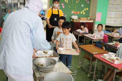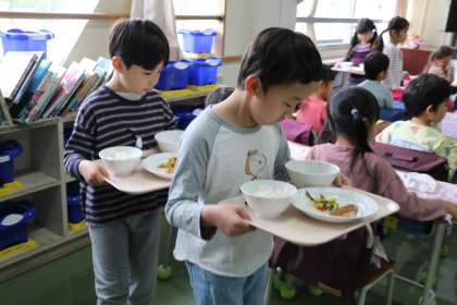 お盆の上に今日は3つもお皿が乗っています。上手に慎重に運んでいます。