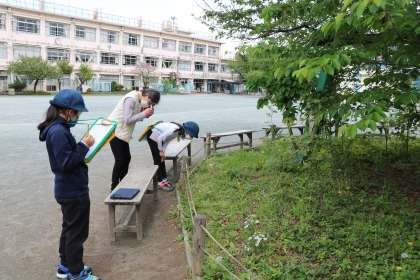 3年生が理科の時間に校庭で植物の観察をしています。虫眼鏡で見たり、タブレットで写真を撮ったり楽しそうです。