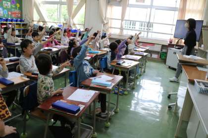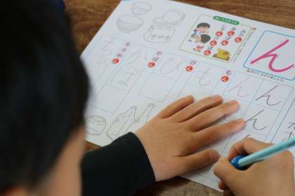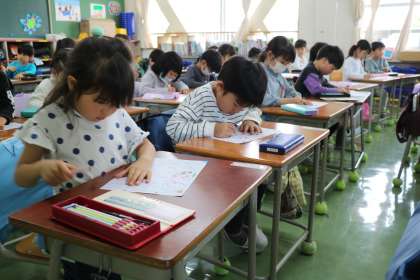 書き順や、きれいに書くポイントをみんなで確認したら、練習です。鉛筆の持ち方を一人ひとり先生が確認しながら練習しています。