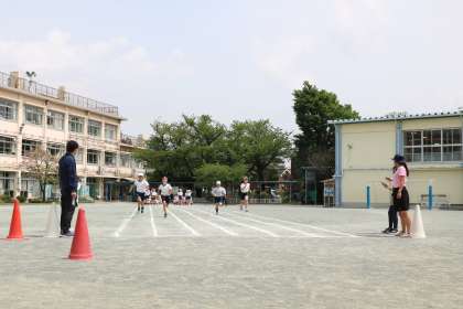 6年生学年体育の様子です。全国学力・学習状況調査で頑張った後は、短距離走の練習です。十分準備運動をして臨みます。