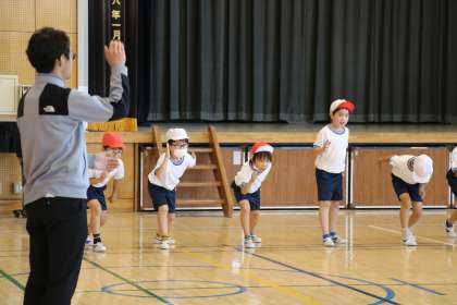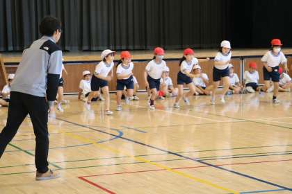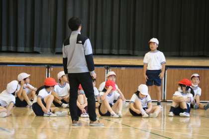 3年生体育「走の運動」の様子です。短距離走のスタートと走り方について先生と確認します。運動会では中学年になったので、80メートルの曲走路を走ります。今日は体育館での体育だったのでできませんが、外で実際に80メートル走ることをとても楽しみにしている子どもたちです。