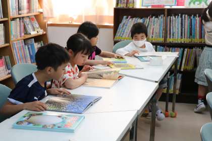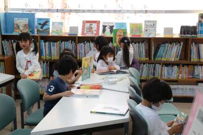 1年生初めての図書です。司書の先生に、図書室の使い方を教えていただいて、さっそく自分の好きな本を読みました。1人2冊まで貸し出しもできます。