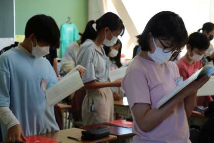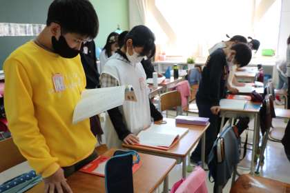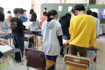 「国語」の学習です。長文の物語文を全員で役割を持ちながら音読します。文章を目で追いながら、自分のところでは声に出す。友達の声をしっかり聴かないとできません。集中して静かな中に、一体感を感じるクラスです。