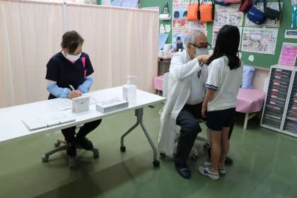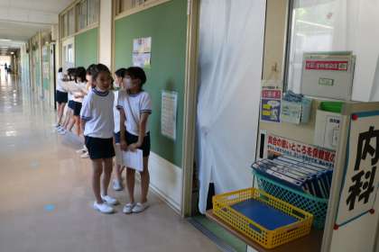 今日は3・4年生、校医先生による内科健診がありました。一人ひとり話を聞きながら丁寧に健診をしていただきます。廊下で順番を待っている子たちはとても静かです。