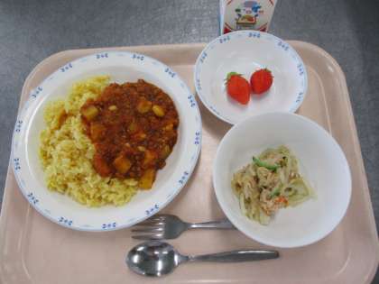 チリビーンズライスは、カレー味のご飯の上に、チリパウダーが入ったトマト味のミートソースをかけています。大豆とレンズ豆が入っています。大豆がおいしく食べられて、こどもたちからも人気のあるメニューです。不足しがちな鉄分を補うために、鶏レバーもいれています。いちごはやよいひめという種類です。甘くてとてもおいしいいちごでした。