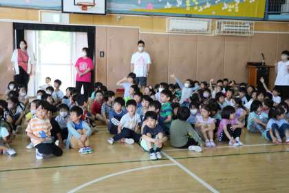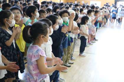 そして、2〜6年生がワンフレーズずつ歌い1年生がその後に繰り返して歌います。その時は、1年生が歌うたび聞いていた2〜6年生が「じょうずだね」と、拍手をしてくれます。最後に退場する時も、2年生が