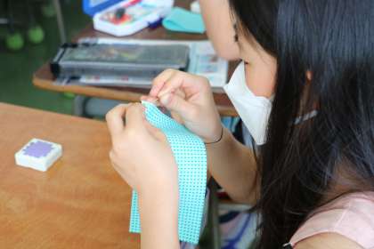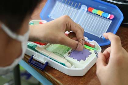 糸を斜めに切って・・・と、さんざん苦労して糸を通した後に、糸通し器の使い方も教わりました。子どもたちからは