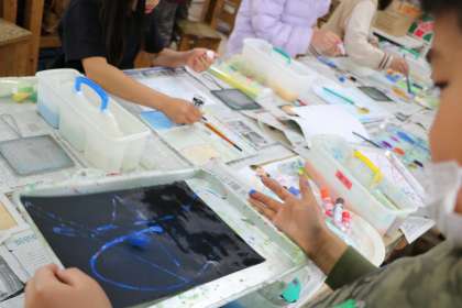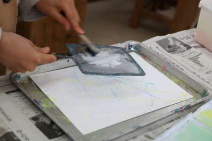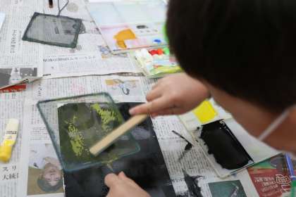 もようの紙を作ります。ローラーで彩色する方法、網とブラシで彩色する方法、ビー玉に絵具を付けて転がしながら彩色する方法、様々な表情を楽しんでいます。