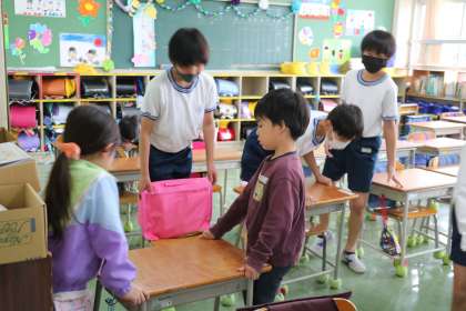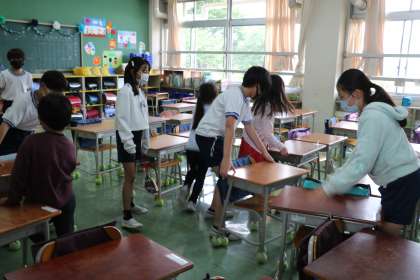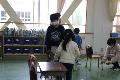 1年生は今週から5時間目が始まります。昼休み中は6年生が来てくれたので一緒にお掃除タイムです。