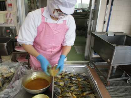 2枚目の写真は鰆を西京みそのたれにつけているところです。身が柔らかく、おいしい鰆で、こどもたちもよく食べていました。