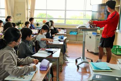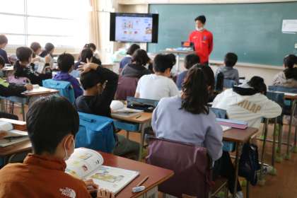 5年生外国語、朝学習の後の学活の様子です。外国語は短いプログラムの画像が用意してあるのでそれを見ながら進めます。
