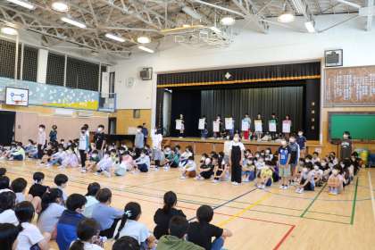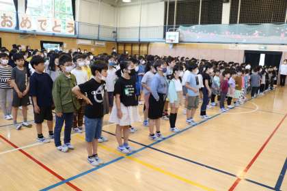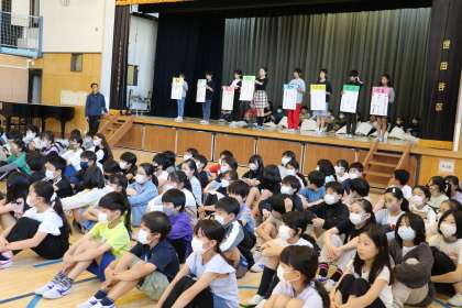 5・6年生と1・2・3・4年生が向かい合わせに座ります。舞台の上には委員長が立ち、その委員会の5・6年生委員もフロアーに一緒に立って、委員会の仕事内容などを話します。
