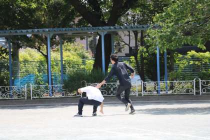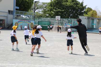 変わり鬼ごっこをしていたのですが、鬼がわからなくなってしまいました。あらら、いつの間にか2年生と1年生が一緒になり・・・先生が先生にタッチ!捕まってしまいました〜
